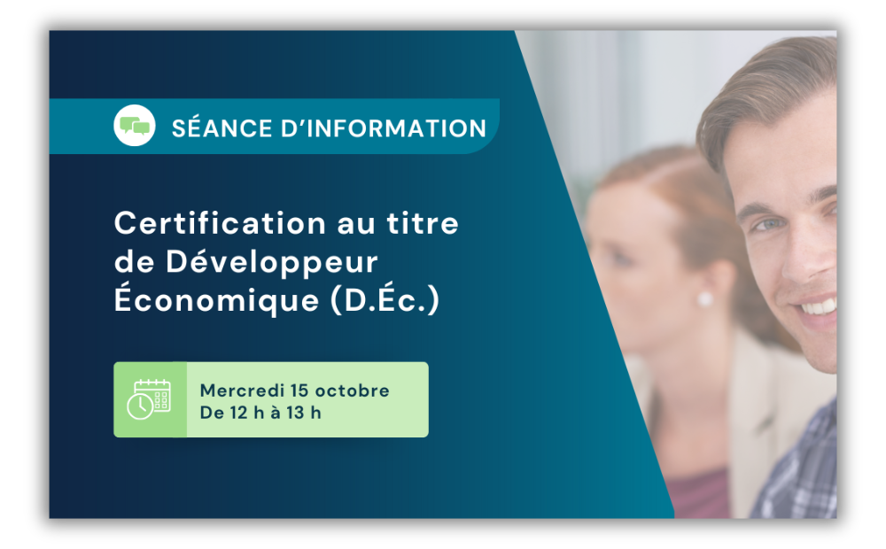 Obtenez le titre de Développeur économique (D.Éc.), une certification professionnelle reconnue à l’échelle canadienne. Elle valorise votre expérience, vos compétences, et votre engagement envers les standards de la profession. Cette reconnaissance officielle constitue un atout important pour renforcer votre crédibilité auprès de vos partenaires et clients.