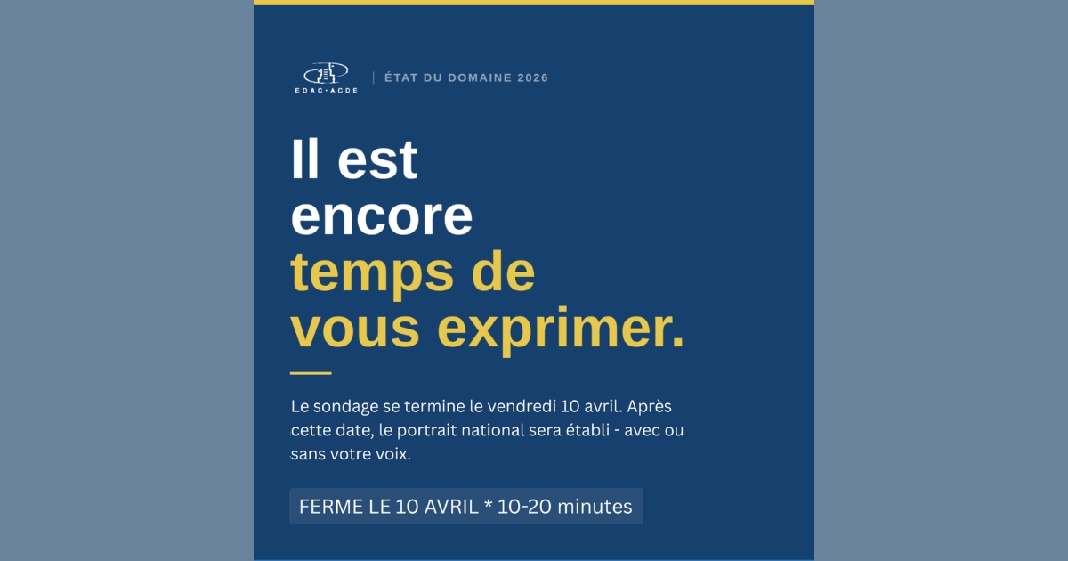 L’ADEC mène actuellement l’enquête « 2026 State of the Field Survey / État des lieux en 2026 », qui dresse un portrait national de qui nous sommes, de ce que nous faisons et de ce dont nous avons besoin pour prospérer en tant que profession. Que vous travailliez dans une petite municipalité rurale ou dans un grand centre urbain, votre point de vue compte et mérite d’être pris en considération.